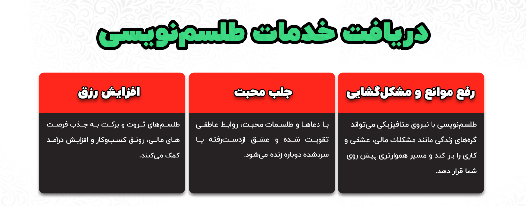 تمامی خدمات من بر پایه دعاهای اسلامی، آیات قرآن، روایات معتبر و علوم روحانی حلال انجام میشود. هرگونه طلسمنویسی در دانمارک که توسط من انجام شود، در چهارچوب قوانین شرعی و اخلاقی بوده و با نیت خیر، گشایش و اصلاح زندگی افراد صورت میگیرد. بههیچوجه از علوم غیراخلاقی یا سیاه استفاده نمیکنم.