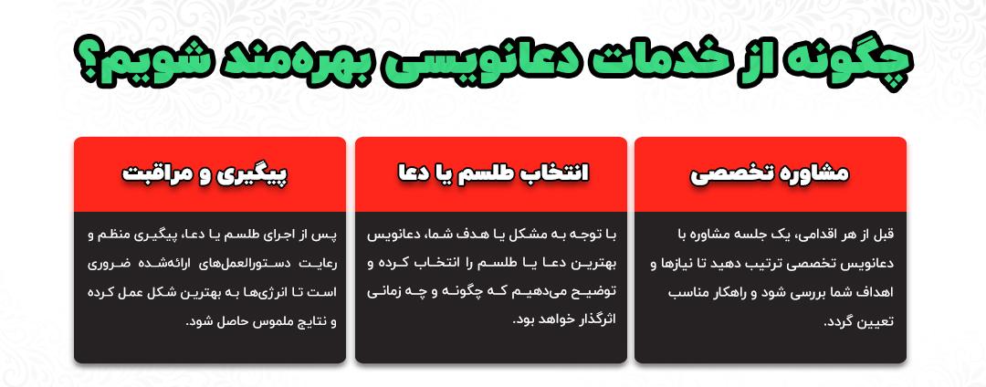 تمامی دعاها و طلسمات به صورت کاملاً شرعی و اخلاقی انجام میشود.پشتیبانی و مشاوره مستمر